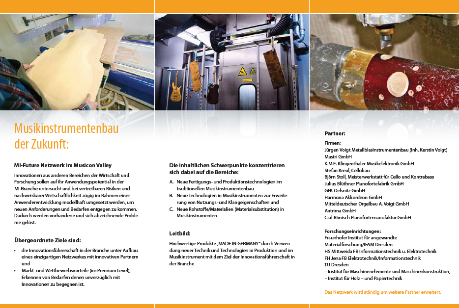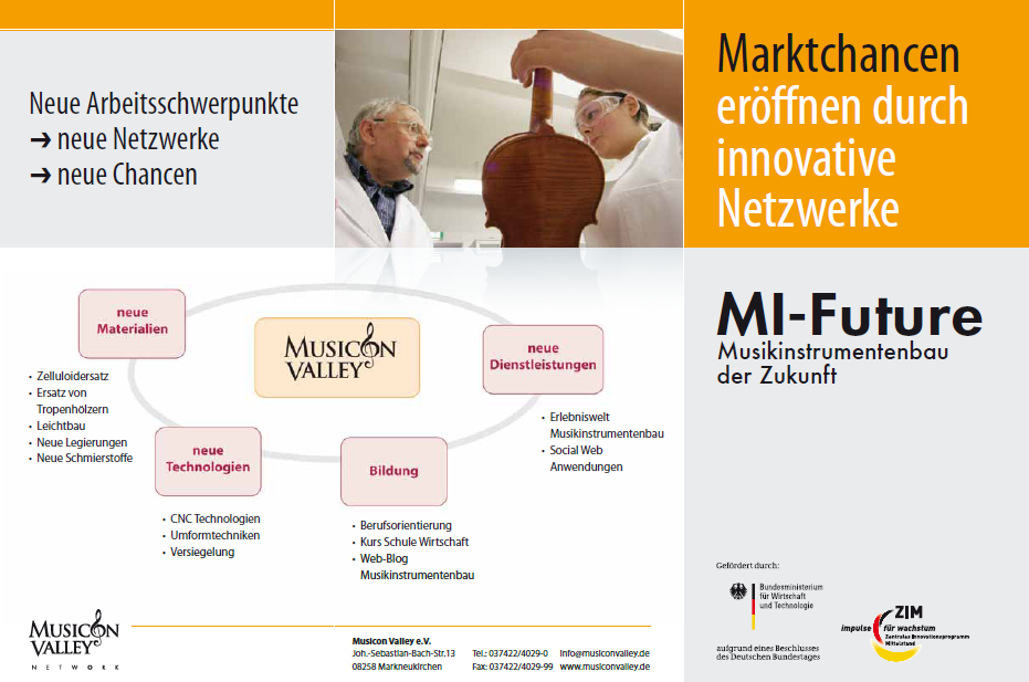Unser MI - Future Netzwerk wurde vom Bundesminsterium für Wirtschaft und Technologie als besonderes Erfolgsbeispiel ausgewählt und entsprechend auf den Internetseiten des Ministeriums präsentiert. Unter der Überschrift "Innovationen in Sicht" wird einmal mehr gezeigt, dass Musikinstrumentenbau und Innovationen zusammen gehören.